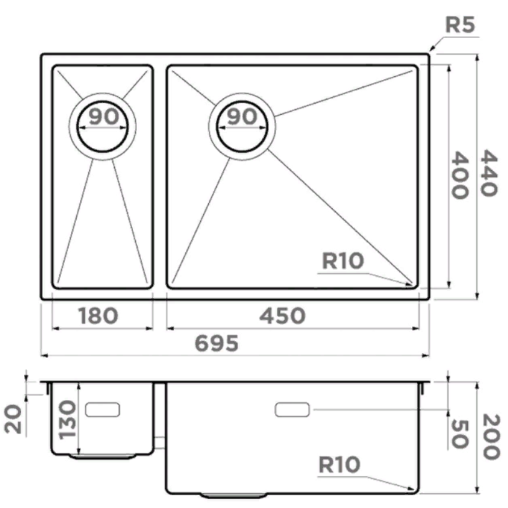 Мойка кухонная Omoikiri из коллекции Taki 69-2-U/IF-IN-R Side имеет размеры 695х440 мм., изготовлена из нержавеющей стали. Форма — прямоугольная, одна чаша без отверстия для смесителя. Сифон в комплекте. Ширина чаши 45. Подстольный и врезной монтаж, монтаж вровень. Имеется дополнительная чаша.