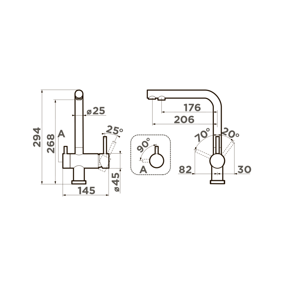 Смеситель для кухни Omoikiri Nagano с подключением фильтра оснащен рычажным управлением для регулировки температуры и напора воды. Горизонтальный монтаж на 1 отверстие. Поворотный излив 176 мм.