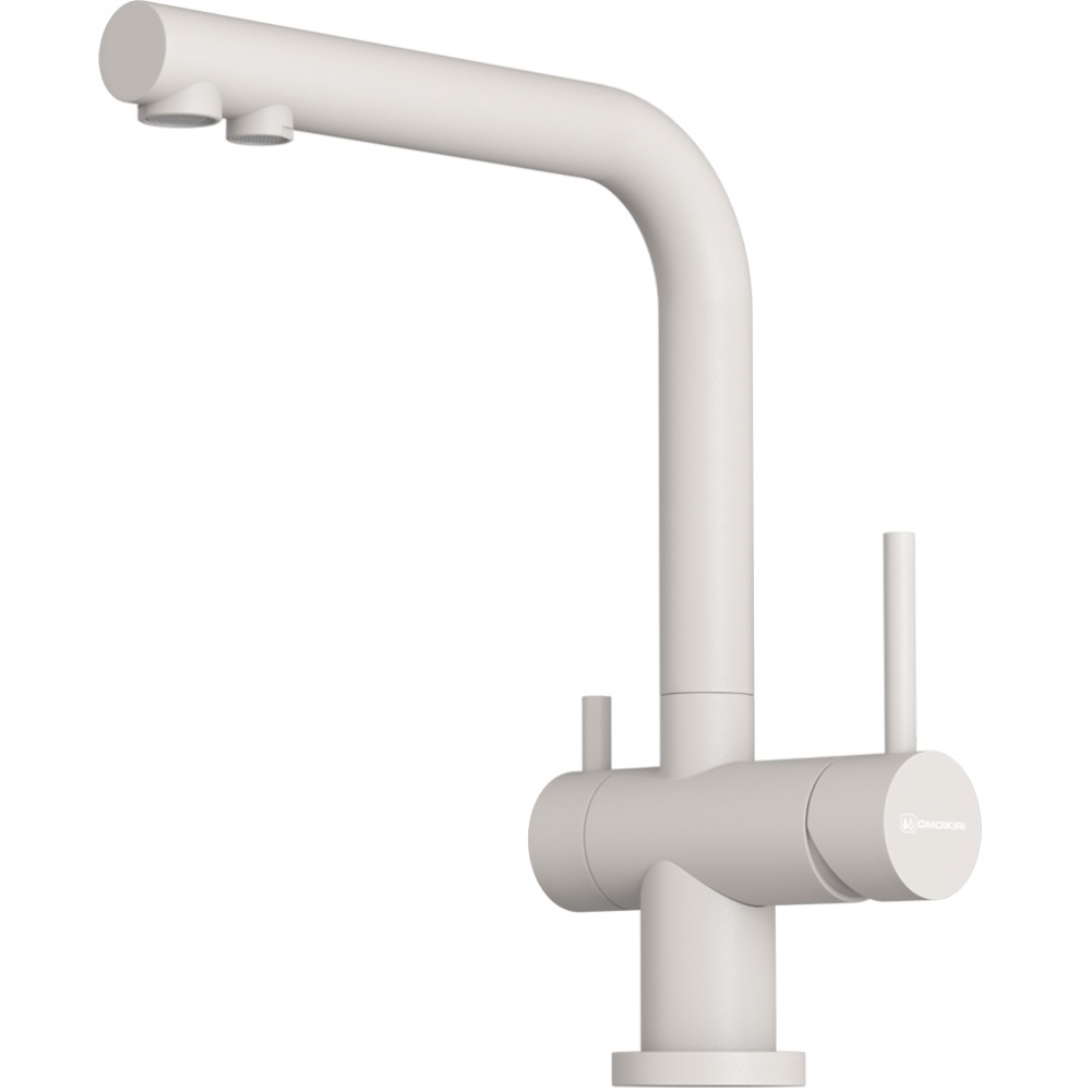Смеситель для кухни Omoikiri Nagano с подключением фильтра оснащен рычажным управлением для регулировки температуры и напора воды. Горизонтальный монтаж на 1 отверстие. Поворотный излив 176 мм.